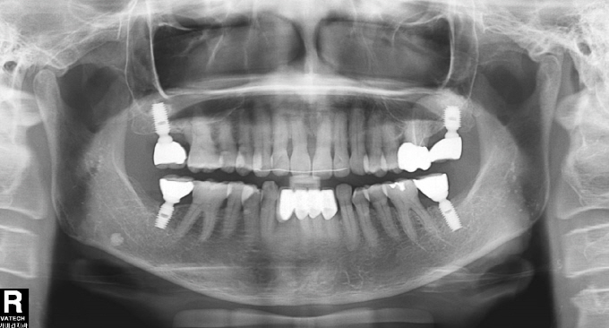 | Fig. 2: 62¼¼ ¿©ÀÚ, Àå±â°£ Ä¡ÁÖ±³Á¤Ä¡·á¸¦ ¸¶ÃÆ°í º¸Ã¶Ä¡·á¿Í ÀÓÇöõƮġ·á±îÁö ÀüºÎ ¿Ï¼ºÇÏ¿´´Ù. |