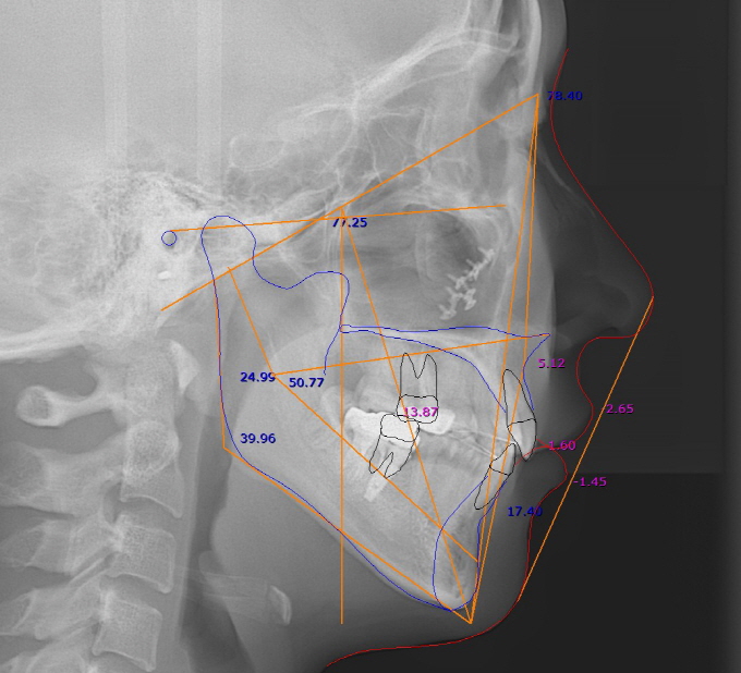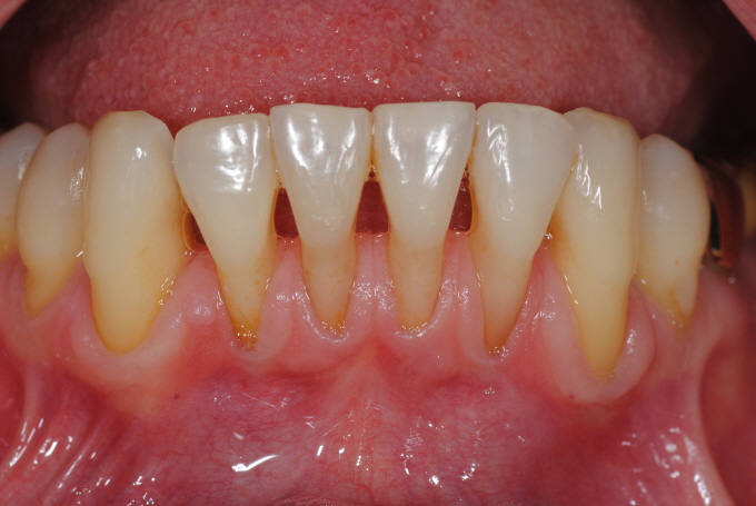 | Fig. 1: 56¼¼ ¿©ÀÚ, ¼øÂ÷Àû Ä¡ÁÖÄ¡·á¿Í ¼ö¼ú ±×¸®°í ±³Á¤Ä¡·á µî Àå±â°£ÀÇ Ä¡·á ³¡¿¡ ¾ÈÁ¤µÈ ±³ÇÕ¿¡ °í¸¥ Ä¡¾Æ¹è¿À» ´Þ¼ºÇÏ¿´°í ´ÙÀ½ ´Þ Áß¼ø°æ ÇÏ¾Ç ÀüÄ¡ºÎÀ§¿¡ ´ëÇÏ¿© BiotypeÀÇ °³¼± ¹× Ä¡±Ù Çǰ³¸¦ À§ÇÑ Mucogingival Plastic Surgery¸¦ ¿¹Á¤Çϰí ÀÖ´Ù. |