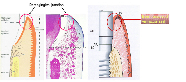 ÀÚ¿¬Ä¡¿¡´Â »óÇÇ¿Í Ä¡¾Æ°¡ ¿¬°áµÇ´Â ºÎÀ§ÀÎ Ä¡¾ÆÄ¡Àº°áÇÕºÎ(dentogingival junction)°¡ Á¸ÀçÇϴµ¥, À̰÷À» ÅëÇÏ¿© ¼¼±Õ, ¼¼±ÕÀÇ µ¶¼Ò ¶Ç´Â Ç׿øµéÀÌ ¸ö ¼ÓÀ¸·Î µé¾î¿Ã »Ó ¾Æ´Ï¶ó, ¿©·¯ ¸é¿ª°ü·Ã ¼¼Æ÷µéÀÌ À̵¿ÇÏ¿© ¿ì¸® ¸öÀ» ¹æ¾îÇϱ⵵ ÇÏ´Â ¸Å¿ì ¿ªµ¿ÀûÀÎ Çö»óÀÌ ÀϾ´Â °÷ÀÌ´Ù. ¿°ÁõÀÌ ÀÖ´Â °æ¿ì´Â ÀÌ °áÇպΰ¡ ÆÄ±«µÇ¸ç, ¿Ü°úÀû ¶Ç´Â ºñ¿Ü°úÀûÀÎ Ä¡ÁÖÄ¡·á½Ã¿¡´Â ÀǵµÀûÀÎ ¼Õ»óÀ» Áֱ⵵ ÇÑ´Ù. ¾î¶² °æ¿ìÀÌ°Ç Ä¡°úÀÇ»ç´Â ÀÌ °áÇպθ¦ ¿ø·¡ÀÇ ÇØºÎÇÐÀû ±¸Á¶¿Í °¡´ÉÇÑ À¯»çÇÏ°Ô È¸º¹½ÃÄѼ ¿ì¸® ¸öÀ» ¿ÜºÎ·ÎºÎÅÍ º¸È£ÇÒ ¼ö ÀÖ°Ô ÇØ¾ßÇÑ´Ù. ÀÓÇÁ¶õÆ®ÀÇ °æ¿ìµµ ¸¶Âù°¡ÁöÀÇ ¿ªÇÒÀ» ÇÏ´Â ºÎÀ§¸¦ trnasmucosal seal ¶Ç´Â permucosal seal·Î ºÒ¸®¸ç, ÇϹæÀÇ °áÇÕÁ¶Á÷°ú Ä¡Á¶°ñÀ» º¸È£ÇÏ´Â ¿ªÇÒÀ» ÇÑ´Ù(±×¸² 1).