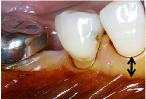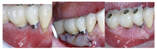 ÀÓÇöõÆ®ÀÇ ¼³ÃøÀ» ±âÁØÀ¸·Î ÇùÃø¹æÇâÀ¸·Î 5mm ÀÌ»óÀÇ °¢ÈÁ¡¸·ÀÌ ÀÖÀ» °æ¿ì´Â Ä¡ÀºÄ¡Á¶Á¡¸·(MGJ)À» ³Ñ´Â ºÎºÐÃþÆÇ¸·À» Çü¼ºÇÏ¿© ÆÇ¸·À» Ä¡±ÙÃøÀ¸·Î À̵¿ÇÏ¿© ºÀÇÕÇÏ´Â À̸¥¹Ù Ä¡±Ù´Üº¯À§ÆÇ¸·¼ú(apically positioned flap)À» Àû¿ëÇÒ ¼ö ÀÖ´Ù(±×¸² 4).