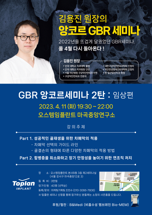 À̹ø GBR ¼¼¹Ì³ª´Â ¡®¼º°øÀûÀÎ °ñÀç»ýÀ» À§ÇÑ Â÷Æó¸·ÀÇ Àû¿ë¡¯, ¡®ÇÕº´ÁõÀ» ÃÖ¼ÒÈÇϰí Àå±â ¾ÈÁ¤¼ºÀ» ³ôÀ̱â À§ÇÑ ¿¬Á¶Á÷ óġ¡¯¸¦ ÁÖÁ¦·Î 1ºÎ¿Í 2ºÎ¿¡ °ÉÃÄ ÁøÇàµÈ´Ù. žÇöõÀº ¿¬ÀÚ¿Í Ã»Áß °£ ÃæºÐÇÑ Q&A ½Ã°£À» Á¦°øÇϱâ À§ÇØ ¼±Âø¼ø 40¸í±îÁö Âü°¡ ½ÅûÀ» ¹ÞÀ» °èȹÀÌ´Ù.