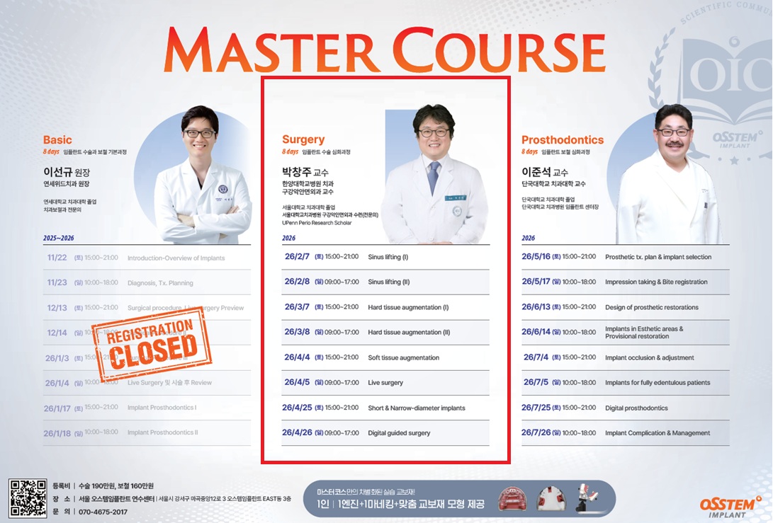 ¹ÚâÁÖ ±³¼ö°¡ µð·ºÅÍ·Î Âü¿©ÇÏ´Â ¸¶½ºÅÍÄÚ½ºÀÇ ³»¿ëÀº OSSTEM Ç÷§Æû(https://www.osstem.com/desktop/map) ȸ¿ø °¡ÀÔ ÈÄ È®ÀÎÇØº¼ ¼ö ÀÖ´Ù. ¼ö°Àº º°µµ ÆäÀÌÁö(https://education.denall.com/course-apply/153/Y)¸¦ ÅëÇØ ½Åû °¡´ÉÇÏ´Ù.