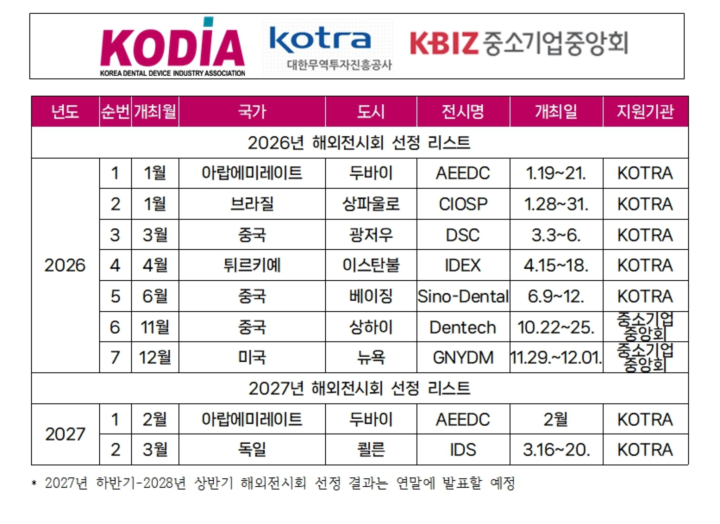 ¿ÃÇØ ÇØ¿ÜÀü½Ã Áö¿øÀÇ Ã¹ ÀÏÁ¤ÀÎ 1¿ù µÎ¹ÙÀÌ AEEDC¸¦ ½ÃÀÛÀ¸·Î, ¡â1¿ù ºê¶óÁú »óÆÄ¿ï·ç CIOSP ¡â3¿ù Áß±¹ ±¤Àú¿ì DSC ¡â4¿ù Æ¢¸£Å°¿¹ À̽ºÅººÒ IDEX(½Å±Ô ÁøÃâ) ¡â6¿ù Áß±¹ º£ÀÌ¡ Sino-Dental µî ÃÑ 7°³±¹ Àü½Ãȸ Áö¿øÀ» È®Á¤Çß´Ù. À̹ø ÀÏÁ¤Àº ±âÁ¸ ¼º°ú°¡ °ËÁõµÈ ÁÖ¿ä ½ÃÀåÀ» Áß½ÉÀ¸·Î ÇϵÇ, Æ¢¸£Å°¿¹ µî Àü·«Àû ½Å½ÃÀå ÁøÃâÀ» º´ÇàÇÏ´Â ±¸Á¶·Î ±¸¼ºµÆ´Ù.