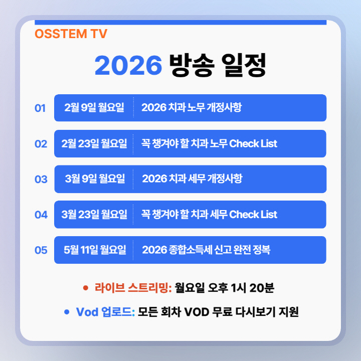 ¿À½ºÅÛÀÓÇöõÆ®(ȸÀå ÃÖ±Ô¿Á)°¡ ¿î¿µÇÏ´Â OSSTEM TVÀÇ Ä¡°ú °æ¿µ Àü¹® ÇÁ·Î±×·¥ ¡®¼º°ø °æ¿µ¡¯ÀÌ ÃÖ¹ÎÈ£ ³ë¹«»ç(³ë¹«¹ýÀÎ ÅÂÁ¾)¿Í ÇÔ²² ¡®2026 Ä¡°ú ³ë¹« °³Á¤»çÇס¯À» ÁÖÁ¦·Î ù ¹æ¼ÛÀ» ½ÃÀÛÇÑ´Ù°í ¹àÇû´Ù. ÀÌ´Â ½Å³â ³ë¹« °³Á¤¿¡ µû¶ó ³õÄ¥ ¼ö ÀÖ´Â ³»¿ëÀ» ½±°Ô Ç®¾î Ä¡°ú ¿øÀå´Ôµé¿¡°Ô ¼Ò°³ÇØ º¸´Ù ¿øÈ°ÇÑ °æ¿µ Ȱµ¿¿¡ ±â¿©Çϱâ À§ÇÔÀÌ´Ù.