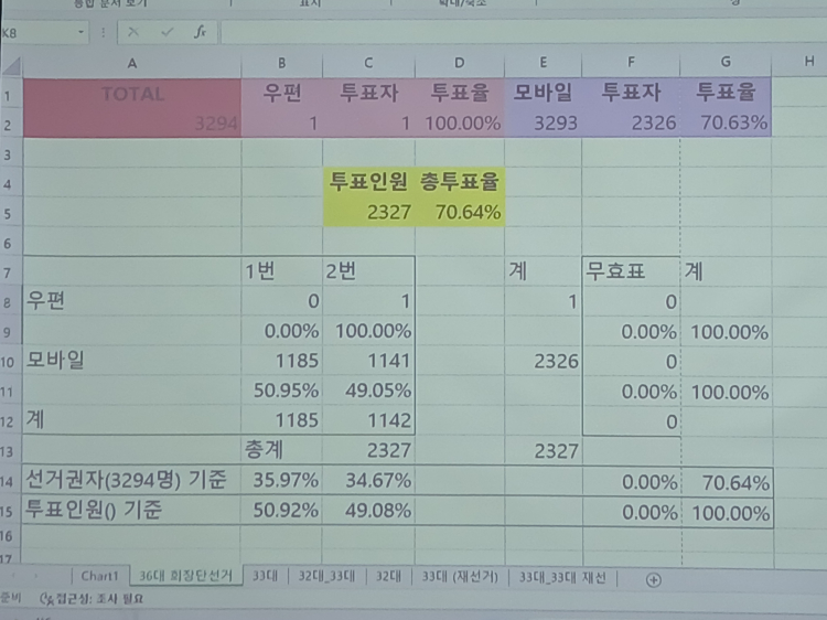 À̹ø ¼±°Å´Â Àüü ¼±°Å±ÇÀÚ 3294¸í °¡¿îµ¥ 2327¸íÀÌ ÅõÇ¥¿¡ Âü¿©ÇØ ÅõÇ¥À² 70.64%¸¦ ±â·ÏÇß´Ù. 2023³â 2¿ù Ä¡·¯Áø 35´ë ȸÀå´Ü ¼±°ÅÀÇ ÅõÇ¥À² 65.55%¿Í ºñ±³ÇÏ¸é ´Ù¼Ò »ó½ÂÇÑ ¼öÄ¡´Ù.