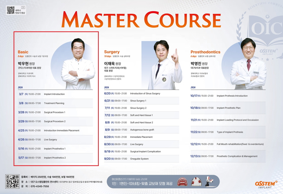 °¿¬ÀÇ ÁÖÁ¦´Â ¡â3¿ù 7ÀÏ(15½Ã~21½Ã) Implant Introduction ¡â3¿ù 8ÀÏ(9½Ã~17½Ã) Treatment Planning ¡â3¿ù 28ÀÏ(15½Ã~21½Ã) Surgical Procedure 1 ¡â3¿ù 29ÀÏ(9½Ã~17½Ã) Surgical Procedure 2 ¡â4¿ù 25ÀÏ(15½Ã~21½Ã) Introduction Immediate Placement ¡â4¿ù 26ÀÏ(9½Ã~17½Ã) Live Surgery ¡â5¿ù 16ÀÏ(15½Ã~21½Ã) Implant Prosthetics 1 ¡â5¿ù 17ÀÏ(9½Ã~17½Ã) Implant Prosthetics 2 µî ÃÑ 8ȸ·Î ±¸¼ºµÅ ÀÖ´Ù.