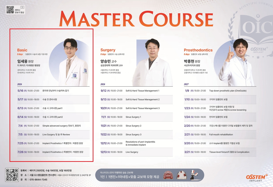 ¼¿ï 5¿ù ÀÓ¼¼¿õ ¿øÀå ¸¶½ºÅÍÄÚ½º º£ÀÌÁ÷ °úÁ¤ÀÇ ¼¼ºÎ ³»¿ëÀº OSSTEM Ç÷§Æû ³» Education¸¦ ÅëÇØ È®ÀÎÇÒ ¼ö ÀÖ´Ù. ÇØ´ç ¼¼¹Ì³ª´Â 20¸í Á¤¿øÀ¸·Î ¿î¿µµÇ¸ç, ¼¿ï ¿À½ºÅÛÀÓÇöõÆ® ¿¬¼ö¼¾ÅÍ(¼¿ï½Ã °¼±¸ ¸¶°îÁß¾Ó12·Î 3, ¿À½ºÅÛÀÓÇöõÆ® Áß¾Ó ¿¬±¸¼Ò º»»ç EASTµ¿ 3Ãþ 10¼¼¹Ì³ª½Ç)¿¡¼ ÁøÇàµÈ´Ù.